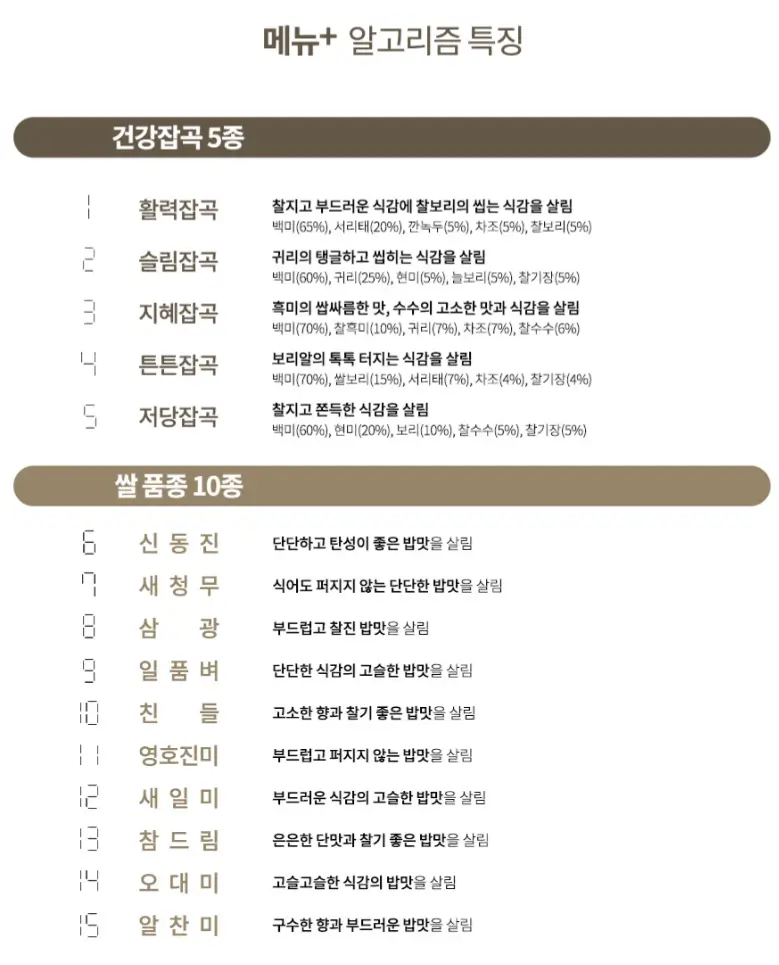 그리고 저도 살 때는 자세히 안 봤지만, 지금 올리다가 보니 품종별 취사라는 게 있었군요.