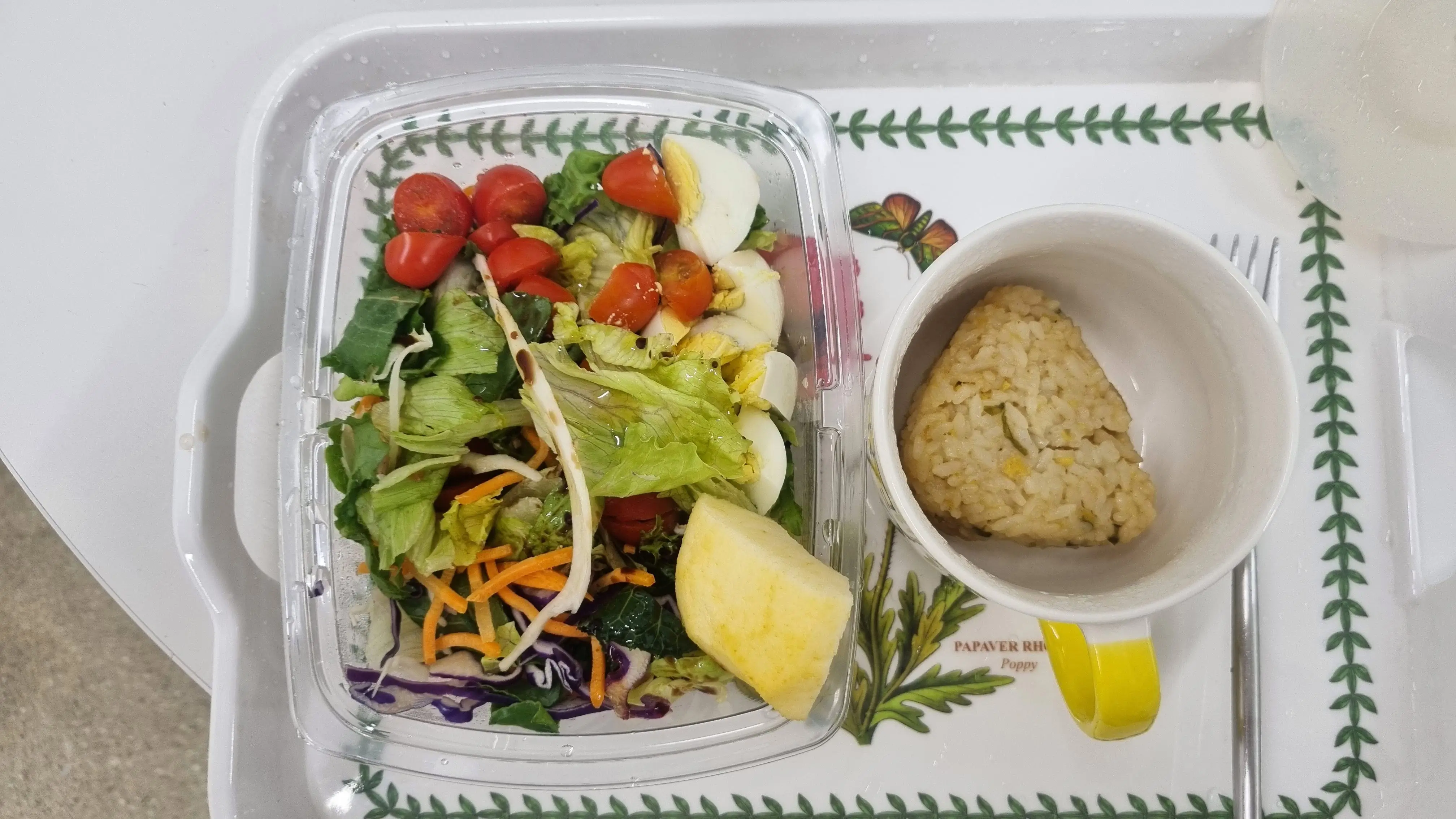 보통 샐러드에 계란이나, 작은 주먹밥 또는 고구마나 빵, 닭가슴살, 나또, 과일 등 그때 그때 집에 있는 식품을 가져다 같이 먹고 있어요. (나름 영양소 맞추려고 ㅎㅎㅎ)