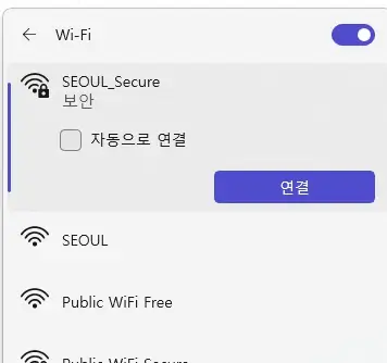 - 와이파이 목록에서 SEOUL_Secure를 선택합니다.