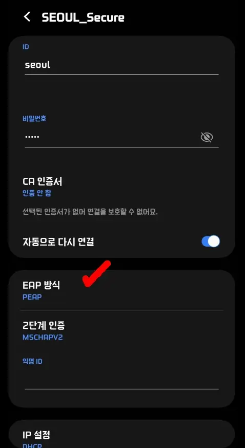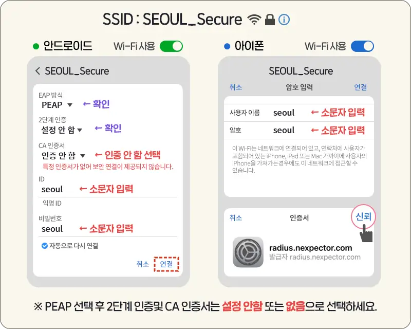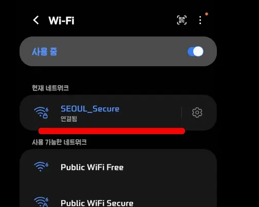 - 와이파이 목록에서 SEOUL_Secure를 선택합니다.