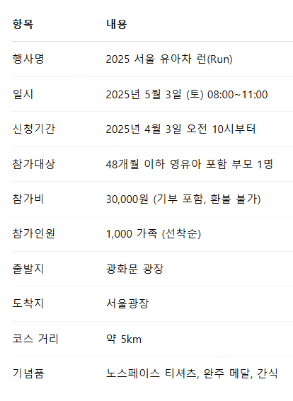 - 행사일정 : 2025년 5월 3일(토) 08:00 ~ 11:00 / 유아차 런 출발 오전 9시