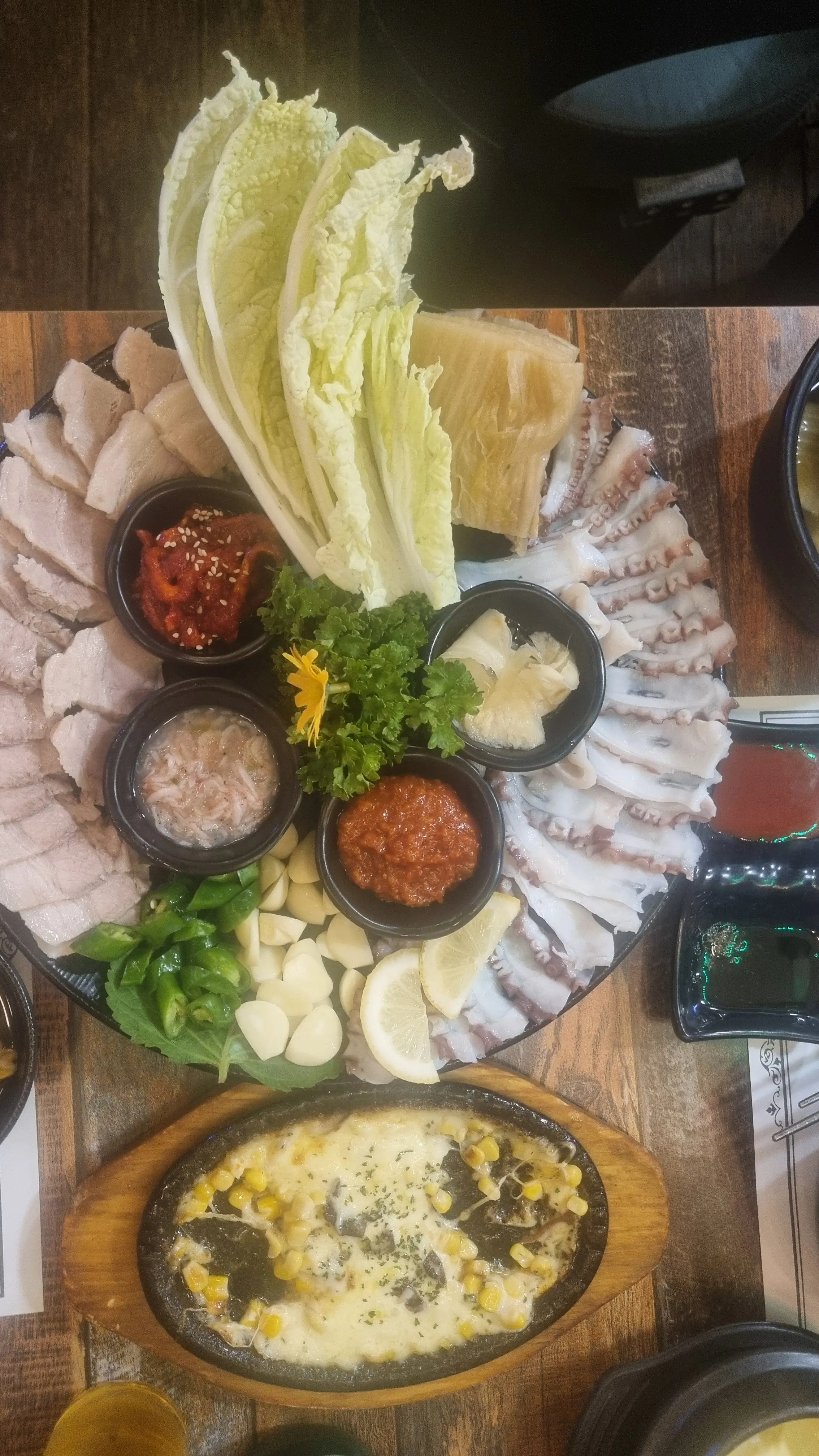그리고 기본으로 나온 콘치즈와 계란찜은 문어가 들어가 있는 또 하나의 별미였어요. 고소하게 녹은 치즈와 달콤한 콘이 만나서, 고기나 문어와 함께 먹다 보면 자연스레 손이 가는 메뉴였어요.