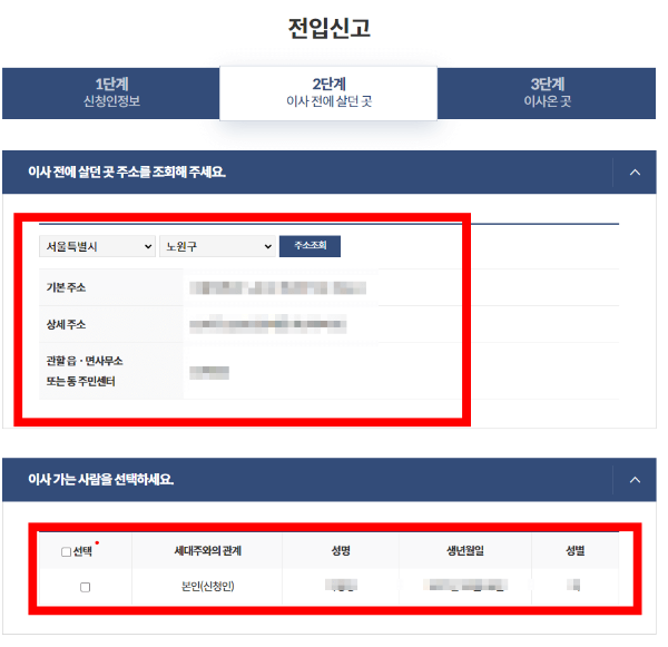 3단계 이사온 곳의 정보를 입력하도록 나옵니다.