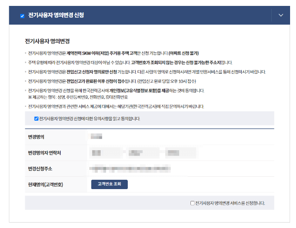 전기사용자 명의 변경신청란은 아래처럼 나옵니다.