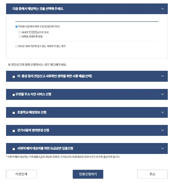 전기사용자 명의 변경도 여기서 되었군요. 저는 따로 한전에 접수해 놓은 상태라 우편물주소이전서비스만 체크합니다.