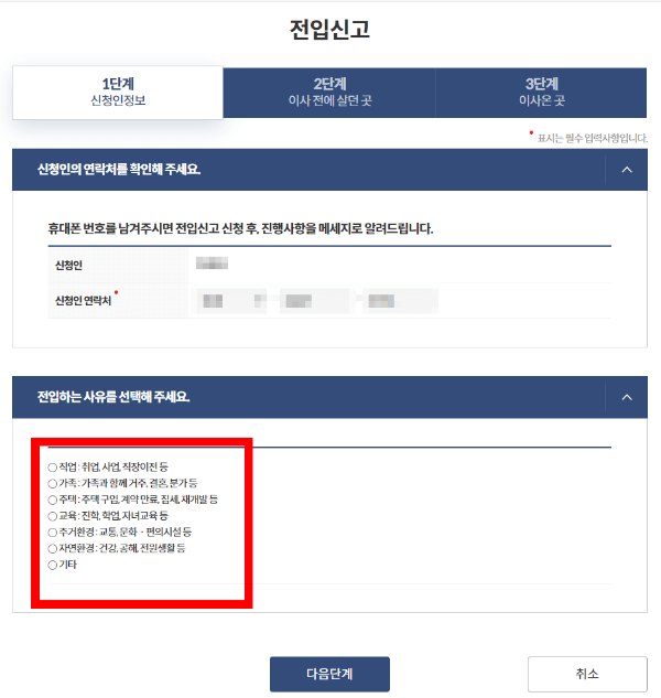3단계 이사온 곳의 정보를 입력하도록 나옵니다.