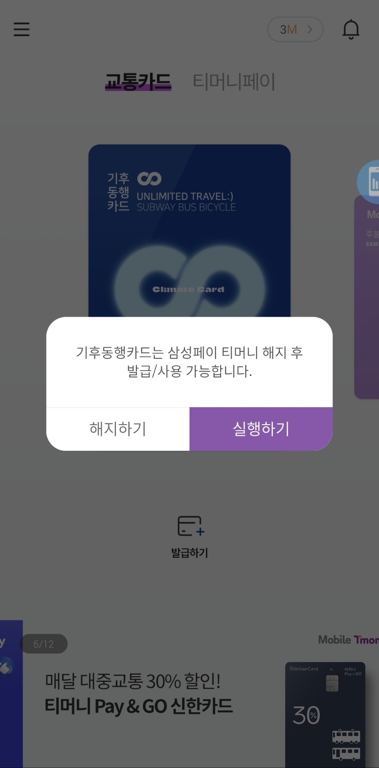 기존 삼성페이 티머니가 있으면 실행이 되지 않으니 반드시 해지 후 실행해주세요.