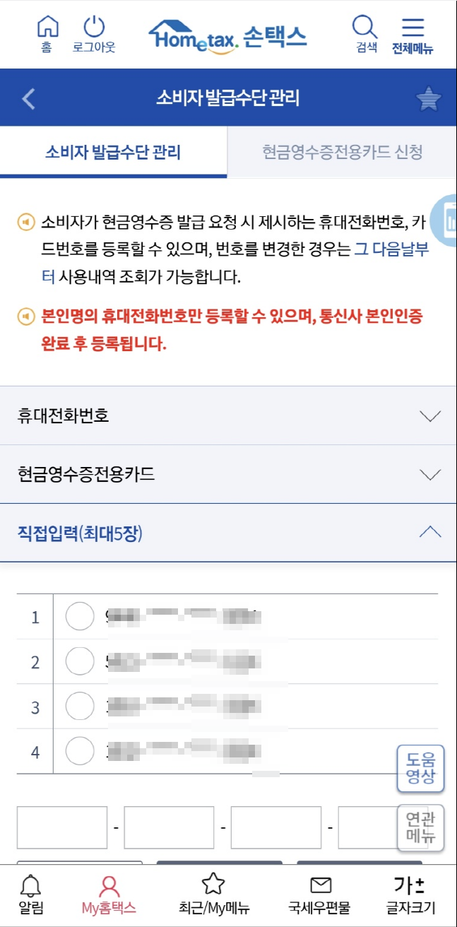전자계산서, 현금영수증, 신용카드 항목 -> 현금영수증(근로자 소비자) -> 하단의 소비자 발급수단 관리를 선택해주세요.