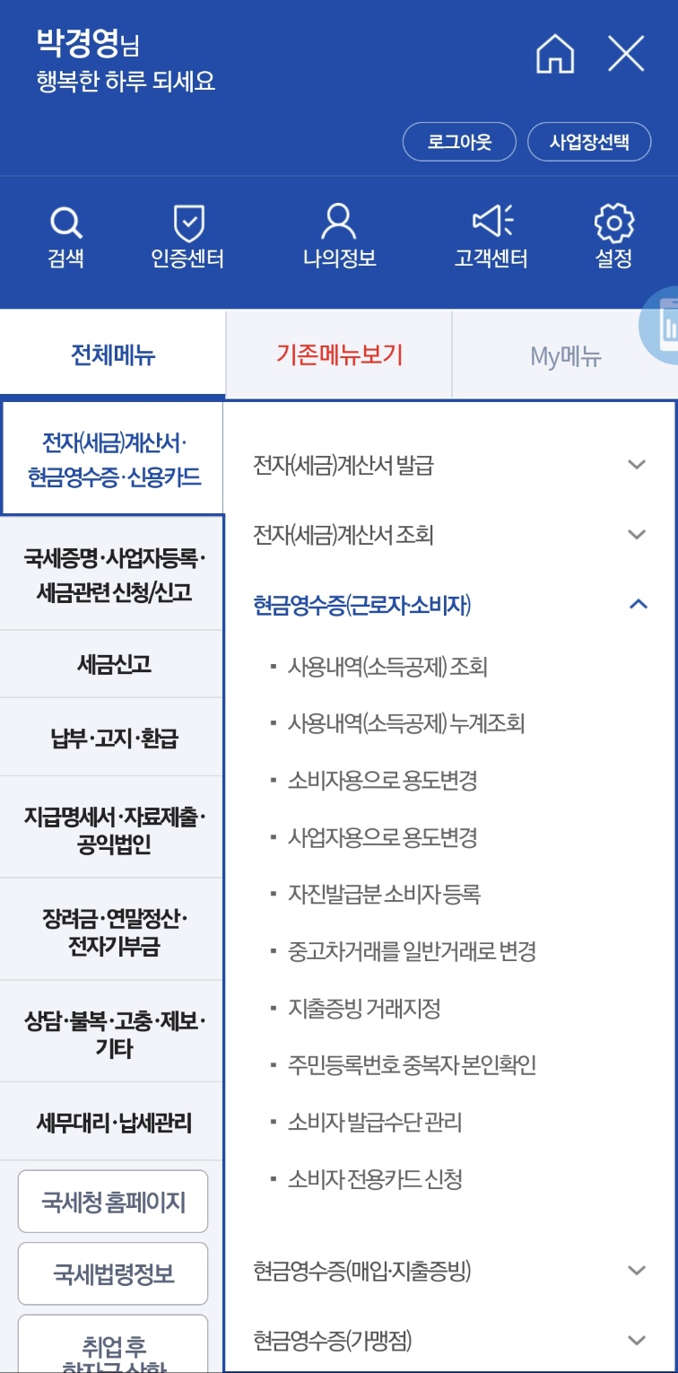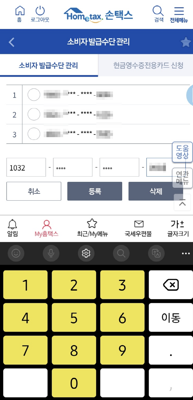 전자계산서, 현금영수증, 신용카드 항목 -> 현금영수증(근로자 소비자) -> 하단의 소비자 발급수단 관리를 선택해주세요.