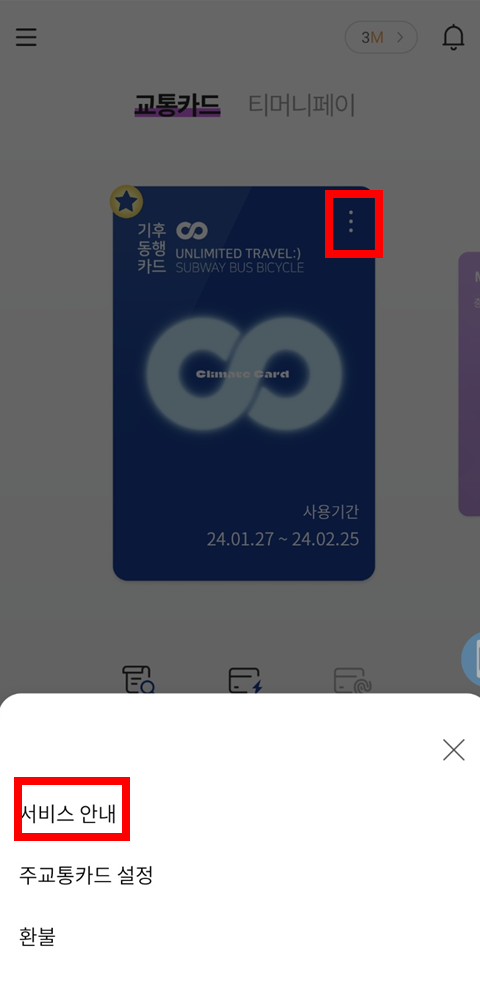 기후동행카드 이미지 상단 점 세개 목록버튼을 누르시면 아래 [서비스 안내] 항목이 나와요