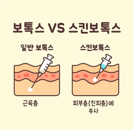 스킨보톡스는 이름 그대로 피부용 보톡스예요. 일반 보톡스는 근육에 넣어서 이마 주름이나 미간 주름을 펴주지만, 스킨보톡스는 피부 표면 가까운 진피층에 촘촘하게 넣습니다.